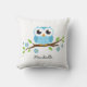 Cute, personalized throw pillow featuring an illustration of a little blue owl sitting on a branch with green leaves and blue flowers. Add a name or other text. Cute and fun design for children.
