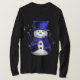 A whimsical and cute Christmas shirt featuring an adorable little snowman dressed in blue top hat and velvet vest, surrounded by blue stars and bows to add some Christmas cuteness to your wardrobe this holiday season.