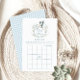 Sophisticated classic "Bingo" game designed for a baby boy shower, adorned with a charming stork carrying baby boy in a cute crest and baby blue gingham pattern at the back. Engage your guests with this delightful game, perfect for adding fun and excitement to your celebration while creating cherished memories.