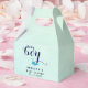 This adorable favor box for a baby shower has a cute ocean theme with a blue whale design. The box is decorated with the words "Baby boy" in a deep navy blue color, and there is a little blue whale happily spraying hearts on a light blue background. What makes it even more special is that it includes the name of the mother-to-be, adding a personal touch to the celebration.