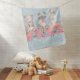 This cute blue baby blanket features a blue woodland background with a raccoon, rabbit, and bear woodland animals sitting on a bed of pink flowers. So cute and sweet for a boy's baby nursery or boy's bathroom. Personalize the bottom by adding the name of your choice.
