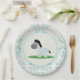 Celebrate your upcoming arrival with these party paper plates. This design features a blue baby zebra with a floral decorative background in colors of teal and light blue.
