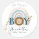 These cute custom baby shower sticker labels feature a watercolor style bohemian safari illustration. The word boy features a little lion head in the center. A blue and beige boho rainbow is pictured in the back. Cute lion cub pawprints are printed along the left.