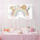 Make your little one's milestone celebration unforgettable with this Cute Boho Safari Animals 1st Birthday Welcome Banner. This beautiful design showcases sweet, watercolor illustrations of a baby giraffe, elephant, lion, and zebra peeking from soft white clouds, centered around a trendy, neutral boho rainbow. Finished with shimmering faux gold glitter accents, this banner is the perfect personalized decoration for a chic, modern jungle or safari-themed party for either a baby girl or boy. Easily customize the name and age to create a welcoming and adorable photo backdrop!
