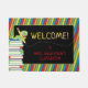 This classroom doormat features a bookworm holding a pencil and sitting on a stack of books. The background is a colorful diagonal stripe pattern. Custom text allows you to personalize this cute teacher doormat.