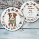 This cute Holiday ornament features a watercolor image of an adorable red and white Border Collie puppy dressed in his winter sweater and hat. The image is framed within a colorful circle wreath made up of various Holiday images, including a snowman, bells, candy cane, stocking, holly, and more! The back of the ornament has the same wreath image with your custom text in green, gold, and red. See more dog (and cat, too!) designs at Dog Village.