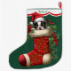 This Holiday stocking has an image of an adorable Boston Terrier puppy peeking out of an ornate red stocking. The image is surrounded by holly, red berries, and poinsettia blooms, and is placed on a Christmas green background. A white scalloped edge design bordered in red holds your customized name at the top. The back of the stocking is identical to the front.