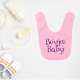 Cute baby bib features "Boujee Baby" text in purple whimsical retro font with added gold stars on pink background.