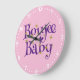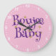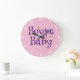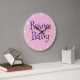 Cute wall clock for nursery features "Boujee Baby" text in purple whimsical retro font with added gold stars on pink background.