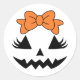 Adorable pumpkin face with eyelashes and bow, perfect for Halloween.