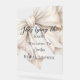 A gorgeous feminine bridal shower welcome sign with a large ivory white watercolor bow angled to the side and draping across most of the sign. A text template is included with the popular "She's tying the knot" theme. Personalize with your event info. This beautiful acrylic sign is a popular choice in party and event signs with a modern look.