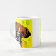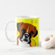 Dog mugs with vector art of a Boxer on yellow background with circles.