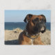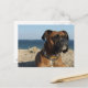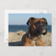 Boxer puppy dog resting on a beach for boxer dog lovers.