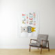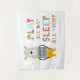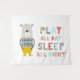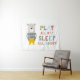 Cute Scandinavian style kids tapestry features boy bear in striped shirt with colorful "play all day sleep all night" text