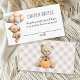 For a fun and practical baby shower activity, add this diaper raffle enclosure card with your baby shower invitations. Each guest brings a pack of diapers to the shower for a chance to win a prize. Designed with little boys in mind, this card has a cute boy teddy bear carrying a bunch of balloons. The back of the card has the bear sitting with an autumn pumpkin over a neutral beige gingham pattern.