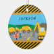 Got a little boy who loves construction vehicles? This custom Christmas ornament is perfect! The holiday ornament has a dump truck, cement truck, and excavator, all working together at a road construction site. A young boy stands near the front with a stop sign to help stop traffic. There are also orange safety traffic cones and background mountains and blue sky. Finish the ornament with your young man's first name on the front and year and photo on the back.