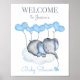 Cute welcome sign which you can personalize for your baby shower. The design features a baby boy elephant taking a nap on a fluffy white cloud with blue love heart shaped balloons. The sign reads "Welcome to [your name's] Baby Shower" in blue and gray lettering. Please browse our store for coordinating signs for your gift and favor tables.