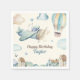 Celebrate a toddler or young boy's birthday with a cute aviation theme. This adorable storybook style design features a bear flying in on an airplane with hot air balloons and puffy clouds flying in to celebrate the birthday boy's special day. The design elements are illustrated in soft watercolors of blue, beige and brown to convey a magical storybook theme. Personalize the text with the child's name or other desired text. Note: these paper napkins are available in 3 different sizes - cocktail, luncheon, or dinner size. Be sure to select the size that best suits your needs.
