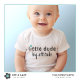 This cute bodysuit for baby boys features a simple blue heart with bold customizable text that says, “Little Dude, Big Attitude.” Customize the text to create a fun baby shower gift for family, friends, or coworkers.
