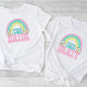 Funny and cute hippie-inspired bachelorette party t-shirt for the bride featuring "The Bride" in a large pink and teal blue retro font, 70's style pop-art flower illustrations and a pink, blue, green and yellow rainbow. Select your color and style of t-shirt. A coordinating "The Party" t-shirt is available for the bachelorette squad.