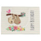 Birthday gift bag with an illustration of a cute brown sloth hanging upside down. This funny little guy is holding onto a branch which has a little pink bird on