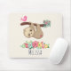 A mouse pad with an illustration of a cute brown sloth hanging upside down. This funny little guy is holding onto a branch which has a little pink bird on
