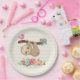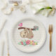 Paper plates with an illustration of a cute brown sloth hanging upside down. This funny little guy is holding onto a branch which has a little pink bird on