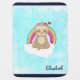 A cute cartoon illustration of a meditating sloth. Wearing a crown of wildflowers on its head, floating peacefully on a white cloud with a colorful rainbow behind. A couple of hearts nearby. Peaceful and happy. Background is a light blue grunge style image. The back is dark blue and has the same sloth image layered over top.