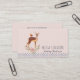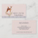 Business cards with a pretty brown deer with a white spotted back. A little bird sitting on the deer's back. A fancy floral bouquet with watercolor roses and light olive green leaves under the deer's feet. A polka dot border along the bottom. Innocent and sweet design with rustic elegance. Peach colored background.