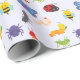 This bug birthday wrapping paper is fun and colorful, with a bug party including a cute bee, purple spider, caterpillar, ant, ladybug, butterfly and snail - all celebrating your kiddo's birthday. Girls and boys alike will love these bug characters!