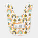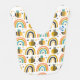 A bib with a cute patterned background. Whimsical bees and rainbows with little hearts and stars scattered around. Adorable and delightful.