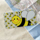 A big yellow and black bumble bee with a bee pattern with some flowers, hearts, swirls, twirls, and bee trails. The big bee illustration can be resized and moved.