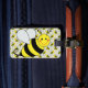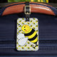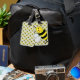 A big yellow and black bumble bee with a bee pattern with some flowers, hearts, swirls, twirls, and bee trails.