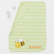 Cute custom receiving blanket for a baby boy featuring an adorable bumblebee on a background of green stripes. Co-ordinates beautifully with today's baby clothing color trends. Colors include yellow, orange, brown and green.