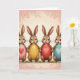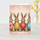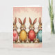 This card features four cute, rabbit-like characters standing side by side in a neat horizontal line, each with plush-looking brown fur, rosy cheeks, and tall ears with soft pink inner details 🐰. Their wide dark eyes and gentle smiles feel like they’re sharing a friendly, affectionate moment together, as if posing for a sweet springtime photo. Each one holds a large smooth egg that fills the lower part of the scene, making the eggs the main focal point. The eggs are glossy pastel shades—soft pink, warm gold, deep red, and calm teal—and each has a lighter heart shape centered on the front, hinting at tender connection. Near the top, a short Easter greeting appears in a simple, easy-to-read style, set in a soft coordinating color that stands out against the pale background 🌷. The background fades from creamy ivory into a blush pink, with faint leafy curls and vine-like patterns drifting along the upper and lower edges like a gentle frame. The soft lighting adds a mild glow to their fur and a smooth shine to the eggs, and the pale botanical accents sit like a light border around the scene.