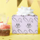 Cute doodle bunny face with big teeth on a pastel purple background.