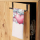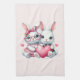 A kitchen towel with an illustration featuring 2 white furry bunnies sharing a big PINK heart. The girl bunny is wearing a cute bow on her head and heart-shaped glasses. The boy bunny is wearing an adorable little suit with a tie.
