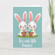 This design shows two fluffy white, rabbit-like characters sitting side by side on a small patch of green grass, their bodies angled slightly inward like close friends 🐰. Behind them is a muted teal background that keeps the focus on their bright faces and the gentle connection between them. Each has wide, shiny eyes, rosy pink noses, and soft pink inside their long ears, with small smiles that feel like they’re sharing a private joke. In their little paws, they hold woven baskets filled with smooth egg shapes in teal, orange, purple, and yellow, adding cheerful pops of color. A soft blush on their cheeks and tiny pink paw pads adds to the tender, affectionate look. Centered below the pair, the phrase “Two cute little Bunnies!” appears in a flowing, cursive-style line of text in a dark tone that stands out against the lighter background 🌷. The baskets are a warm brown with visible weave lines, and the eggs sit layered near the top edges of each basket.