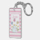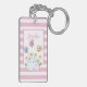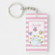 Acrylic keychain with a pink and white striped background. A white frame with a pink border layered over top with your personalized name inside. Inside the frame an illustration a mom and baby bunny standing together. Yellow daisies in the background. Whimsical butterflies fluttering about.