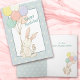 On the front of this pretty birthday card is a little white bunny being carried away by colorful pastel balloons. The teal text inside a pattern frame says "Happy Birthday". Inside the text says "Go ahead, GET CARRIED AWAY!" There's another image of the bunny with the balloons and pink flowers at the bottom.