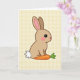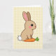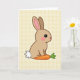 This card features a light-brown bunny 🐰 centered on a creamy yellow background with a faint grid and tiny dotted accents. The bunny sits upright with smooth rounded shapes, a dark outline, and tall ears tipped with soft pink inside. A gentle blush on its cheeks and wide dark eyes give it a shy, affectionate look, like it’s quietly sharing a sweet moment with someone close. In front of it rests an orange carrot with a leafy green top, angled slightly as if being offered with friendly attention 🥕🌷. Any greeting text would sit neatly above the bunny in a soft pink tone, with a smaller line below in warm brown to match the outline. The overall scene keeps the focus on the tender gaze and the simple exchange between bunny and treat. A small white fluffy tail peeks out at the lower edge of the bunny’s rounded body.