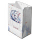 Super cute gift bag featuring cute white little bunny wearing a beautiful pink bow and a crescent silver moon with some gold falling stars.