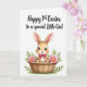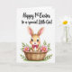 This card features a youthful, human-like rabbit nestled in a rustic woven basket, gazing outward with wide eyes and a small, closed-mouth smile that feels like it’s meant for someone special 🐰. Its soft tan fur is paired with pink inside the long ears and on the tiny paw pads, and a bright fuchsia bow at the neck adds a sweet, affectionate touch. Gentle light washes over the scene, giving the white background an airy springtime look. Around the basket’s rim, green sprigs spill outward as if they were arranged with care for a close friend or loved one, and two pink flowers with sunny yellow centers lean in nearby 🌷. Near the top of the design, a milestone message appears in flowing cursive-style lettering, set in a medium-to-dark gray that stands out clearly against the pale space. The rabbit’s rosy cheeks and the tidy shading along the basket weave add a soft, polished finish without feeling stiff. The basket sits centered at the bottom half of the card, with the greenery and blossoms framing the rabbit while the text stays above in the open white area. Two bright pink blossoms with round yellow centers sit to the right of the basket’s rim, nestled among the green leaves.