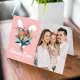 Cute Easter photo card featuring a white bunny holding a bouquet of colorful spring flowers with a pink background. "Happy Easter" is displayed in bold script lettering with your name shown below. The inside of the card features space for your typed or handwritten message. The back of the card features a matching floral pattern.