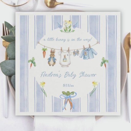 The unique transparent acrylic invitation features a sweet watercolor clothesline strung across the center, proudly displaying tiny, adorable items, each featuring a cute bunny dressed in blue. The scene is completed with darling blue bows holding two bunches of fresh carrots rendered in a soft watercolor style. Easily add your own details and change the font style, size color and placement if you would like to. This invitation is a beautiful keepsake, inviting your guests to share in the "hoppy" anticipation of your baby boy's arrival!
