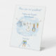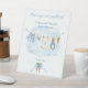 The Sign Our Guestbook Pedestal Sign features a sweet watercolor clothesline strung across the center, proudly displaying tiny, adorable items, each featuring a cute bunny dressed in blue. The scene is completed with a darling blue bow holding a bunch of fresh carrots, and bright, all rendered in a soft watercolor style. Easily add your own details and change the font style, size color and placement if you would like to.