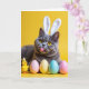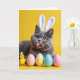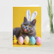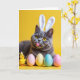 Designed with a slate-gray house cat as the main character, the front shows amber eyes and a tiny pink tongue, with long white bunny ears perched on its head 🐰. The cat sits against a solid marigold-yellow background, and its curious gaze feels like it’s sharing a private joke with someone just out of frame. Soft, even lighting brings out the fur texture and fine whiskers, giving the scene a gentle, friendly closeness. Along the lower foreground, a small fluffy yellow chick figurine wears a tiny gold crown, adding a sweet, companion-like accent. Next to it rests a group of four smooth pastel eggs in blush pink, pale lemon, and sky blue, arranged neatly as if set out for a springtime visit 🌷. Any greeting text would sit centered near the top in a simple white font, standing out clearly against the yellow field. The marigold backdrop matches the warm glow in the cat’s eyes, while the crowned chick and pastel eggs line the bottom edge in a tidy row.