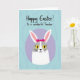 Designed with a sweet spring animal at the center, this card features a white bunny with soft gray facial markings framed inside a lavender circle 🐰. Its tall ears are lined in pale pink, and a bright fuchsia bow sits between them like a little gift, adding a friendly, affectionate touch. The bunny’s yellow eyes with tiny black pupils and gentle lashes look straight ahead, as if making warm eye contact with someone it cares about. A small nose and simple whiskers are drawn with smooth, minimal lines that keep the face soft and approachable. The background is a light sky-blue field with faint teal, wandering lines that feel like a light breeze moving through the scene 🌷. Near the top, the phrase “Happy Easter!” appears in a flowing handwritten-style font, with “to a wonderful Teacher” placed just below it in the same deep black lettering. The bunny sits slightly low on the page, leaving airy space above, with the lavender circle clearly centered against the pale blue backdrop.