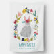 A beautiful rabbit bunny with a folk flower wreath around him with the text Happy Easter. Original artwork by Caroline Bonne Müller
