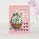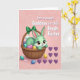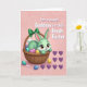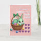 This card shows a mint-green cartoon rabbit 🐰 with big brown eyes, a soft blush on its cheeks, and a small smile as it peeks out of a sturdy woven brown basket. An emerald-green bow sits on the basket handle, adding a sweet touch that feels like a gentle gift between close friends. Inside the basket, pastel eggs in lavender, teal, and sunny yellow are tucked together, with the rabbit’s little white tail visible among them. The background is blush pink with faint swirling patterns that give the scene a soft, dreamy look. Around the base, a few candy-like eggs and tiny pearl dots are scattered like little treats left behind after a shared springtime moment 🌷. On the right side, a neat cluster of deep purple hearts suggests a tender bond without needing any characters to speak. Near the top, a seasonal greeting appears in white lettering, centered above the basket. The hearts sit to the right of the basket in a symmetrical group against the pink backdrop.
